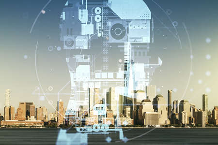 Double exposure of creative human head microcircuit hologram on Manhattan office buildings background. Future technology and AI concept