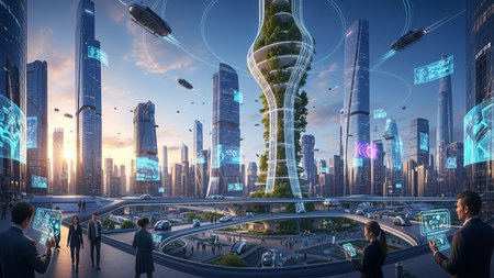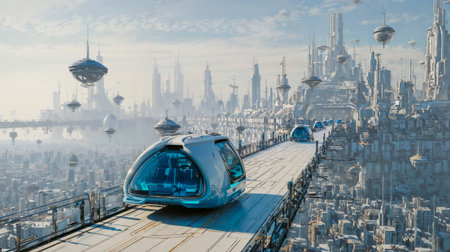 A futuristic cityscape with advanced transportation systems and high-tech architecture in 2026