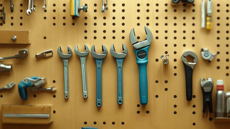 A visually appealing assortment of adjustable wrenches of various sizes displayed on a perforated pegboard. This image illustrates tool organization and functionality in a workshop setting.