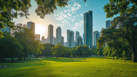 Modern towers may be seen in the backdrop as a green city park is illuminated by sunset.