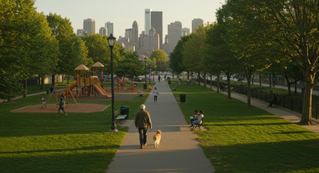 A serene urban park surrounded by tall buildings showcases lush greenery and vibrant trees. The golden hour sunlight casts a warm glow over the tranquil landscape and structures.