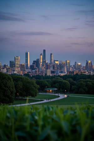 A serene shot of a park in the foreground with tall buildings in the background, illustrating the balance between nature and urban development in the city center.