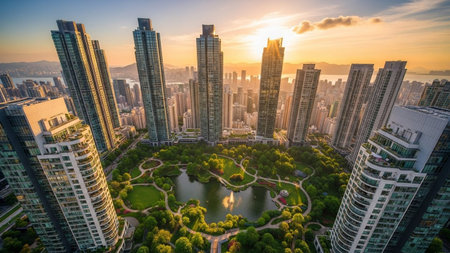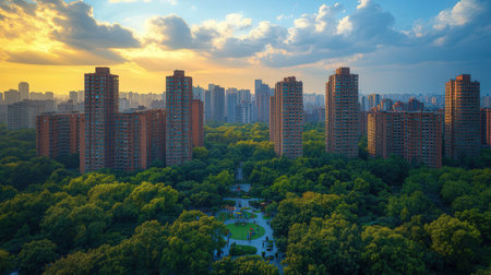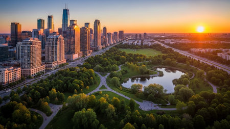 Aerial view showing aerial view of a lush green city park surrounded by modern skyscrapers at sunset.