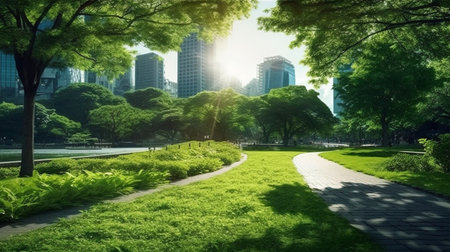 An eye catching illustration of Banner wide picture of green space in urban city. Created using Generative AI tools.