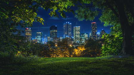 The downtown skyline framed by trees and greenery in a park, with city lights glowing brightly in the background at night.