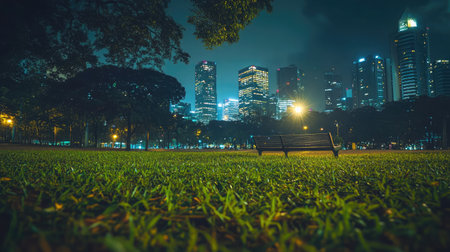 Lone light source brightening green park grass in a peaceful nighttime cityscape