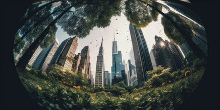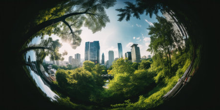 A view of a city through a fish eye lens. Generative AI image.