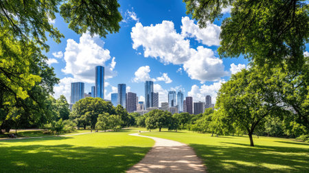 A serene park pathway leads through lush greenery, framed by trees and colorful flowers, with a stunning city skyline in the bright morning light. Perfect for nature lovers.