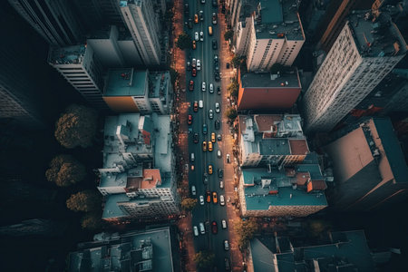 urban landscape of buildings, aerial view of busy city street, created with generative ai