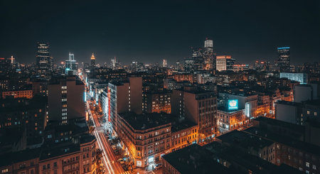 A breathtaking aerial view of a bustling city skyline at night, the streets lit up with twinkling lights and iconic landmarks, capturing the essence of urban travel