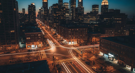 An exhilarating aerial perspective captures the vibrant energy of a major city highway at dusk. Streaks of red and white light from moving vehicles create dynamic trails on the asphalt, illustrating the constant flow of traffic. Towering skyscrapers with illuminated windows pierce the twilight sky, forming an impressive urban skyline. The dramatic colors of the sunset blend with the artificial lights of the city, creating a and energetic scene of urban life and transportation.