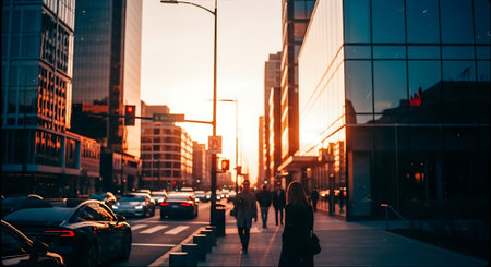 A bustling city street at sunset with people walking and tall buildings