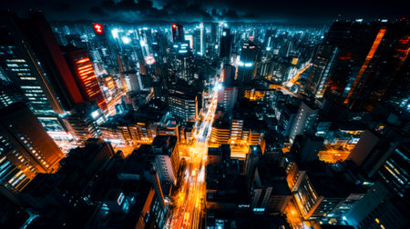Aerial view of the city at night with lot of traffic on the street. Generative AI.