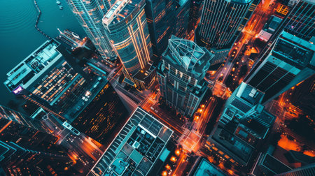 A breathtaking aerial view of a city at dusk, illuminated by streetlights. The skyscrapers reach high into the evening sky, creating a mesmerizing skyline.