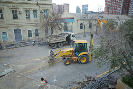 Yellow excavator, bulldozer and working tractor. Road works in the city center.