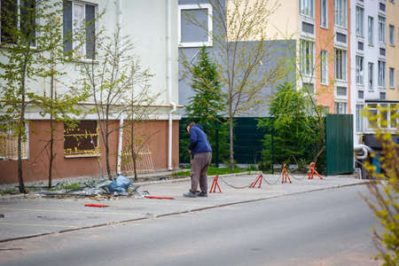 Repair work on the city street. Professional workers dismantle part of the road with a professional tool. Workers remove the asphalt and dig a hole. Technical experts, workflow on the city street