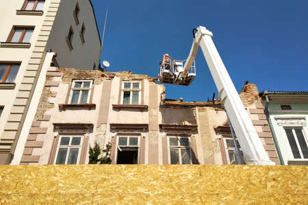 Ghent, Belgium. January 7, 2014. Demolition workers are busy tearing down an old building, while leaving the facade intact, in order to preserve the historic city atmosphere.
