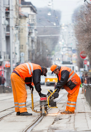 Sofia, Bulgaria - April 7, 2015: Tram road workers are repairing the tram tracks on the tram road.