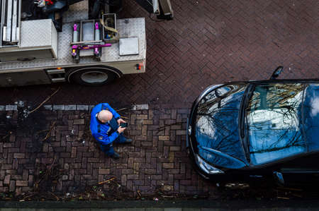 Amsterdam, The Netherlands February 25, 2022: A parking official writing a fine on his phone before towing the car in Amsterdam, The Netherlands