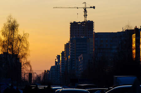 Sunset at the construction site. Silhouettes of cranes and unfinished floors on orange sky background. Moscow, Russia.