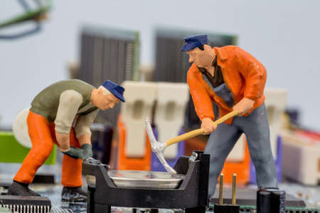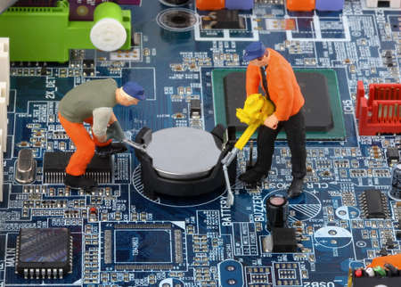 Electronic board with miniature figure worker man at repair and work. Selective focus