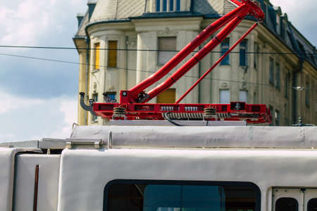 Budapest Hungary july 12, 2020 View of a traditional Hungarian electric tram for passengers driving through the streets and part of the public transport system of Budapest, the capital of Hungary