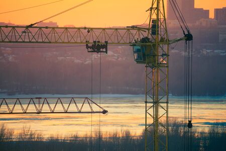 Cunstruction crane on the river sunset background