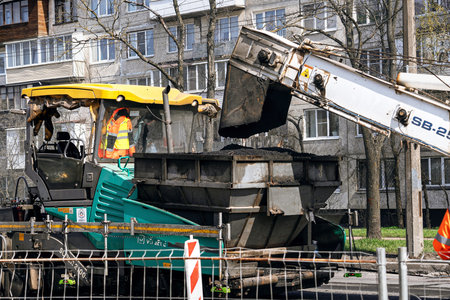 MYKOLAIV, UKRAINE - AUGUST 04, 2021: Workers with road repair machinery laying new asphalt