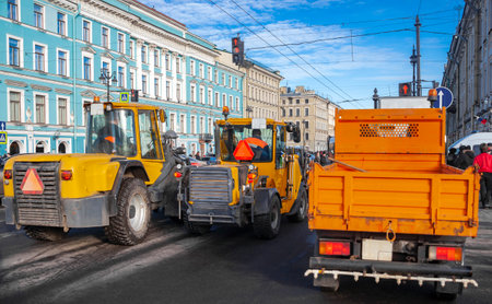 Cleaning equipment conducts spring sweeping of the roadway of Nevsky Prospekt. Special orange-colored equipment cleans and washes the central street of the Northern capital of Russia.