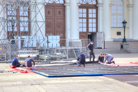 MOSCOW, RUSSIA - April 24.2016: Brigade of workers collect enormous banner with a playbill to the future exhibition in Manege