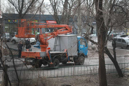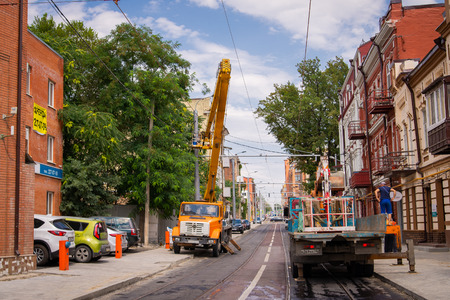 Ukraine, Dnipro - May 14, 2020.Two people are repairing traffic lights near the road on a crane to the cities of Dnieper in Ukraine