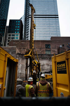 CHICAGO, UNITED STATES - Nov 15, 2019: Two constructions workers supervise a drill.