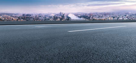 The perspective of the road against the background of sunset and the cityscape