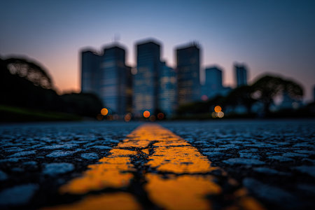 Asphalt road features a prominent yellow line leading toward a stunning city skyline at sunset, highlighting urban beauty and offering copy space for design
