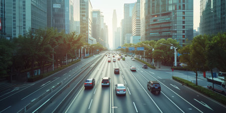 A captivating view of an empty road leading through a modern cityscape. The image features soaring buildings with morning sunlight illuminating the scene.