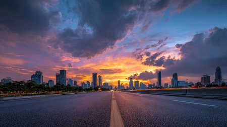 A captivating view of a deserted road leading toward a stunning sunset as skyscrapers emerge against the colorful sky. A tranquil urban scene of beauty.
