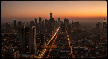 A breathtaking aerial view of a vibrant cityscape at sunset, with reflective skyscrapers and busy streets illuminating the scene as the sun sets on the horizon.