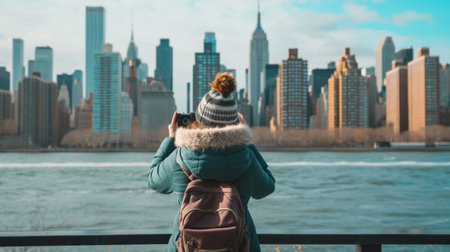 Young girl using mobile phone to take a picture of the big city