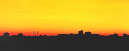 Cityscape with wonderful varicolored vivid dawn. Amazing dramatic blue cloud sky above dark silhouettes of city building roofs. Atmospheric background of orange sunrise in overcast weather. Copy space