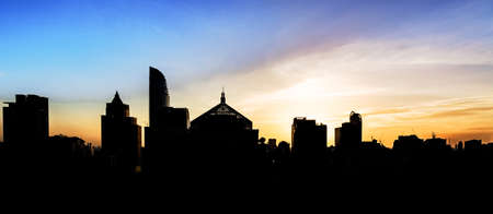 The view of the sunset sky with a beautiful orange color. In decoration with several tall buildings in Shanghai. Blends very beautiful and charming.