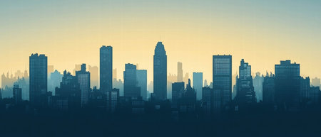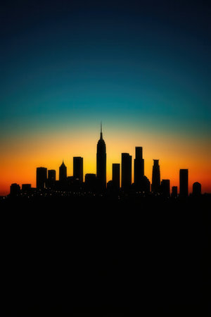 Silhouette of a vibrant urban cityscape at dusk with hyper-realistic detail and soft lighting