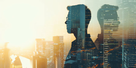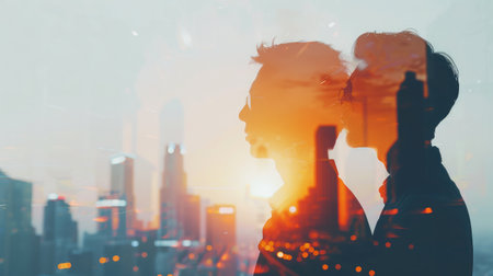 Silhouette of woman blends seamlessly with vibrant city skyline sunset, creating striking double exposure effect. warm colors of sunset contrast beautifully with urban landscape, evoking sense