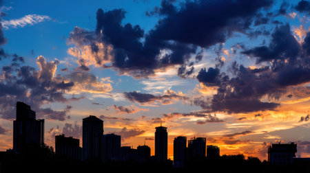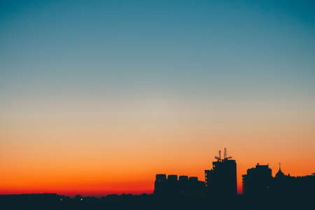 Cityscape with wonderful varicolored vivid dawn. Amazing dramatic blue cloudy sky above dark silhouettes of city buildings. Atmospheric background of orange sunrise in overcast weather. Copy space.