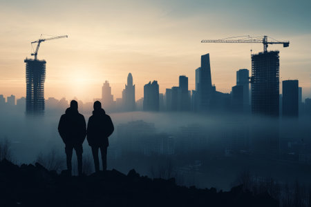 back view of two men and silhouette of modern city with a construction cranes on the background