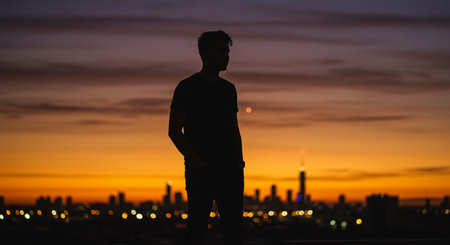A captivating silhouette of an individual stands against a stunning sunset sky, showcasing rich colors and a dramatic urban skyline. Perfect for themes of adventure and solitude.