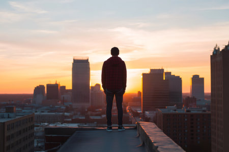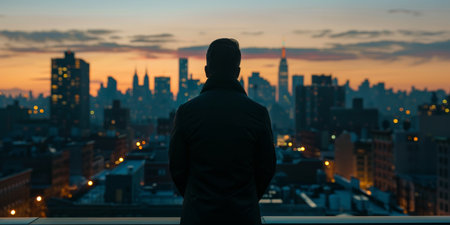 Man standing on a rooftop at sunset, contemplating the sprawling cityscape and reflecting on aspirations, dreams, and future opportunities