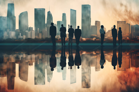 Silhouettes of business people working at corporate office in downtown. Work hard and business development concept. Double exposure