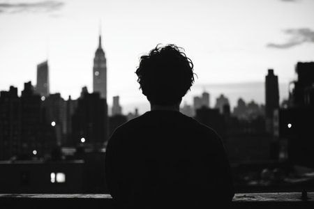 Black and white silhouette of a young man gazing at city skyline from rooftop perspective