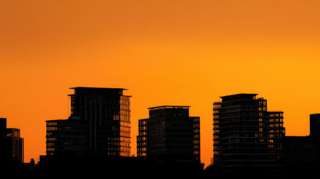 This striking image features the silhouette of modern buildings against a stunning orange sunset sky, capturing the essence of urban tranquility and beauty in twilight.
