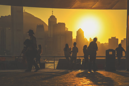Silhouette of young man traveler is visiting at Braemar hill Hong Kong viewpoint in Hong Kong for looking scene of sunset.